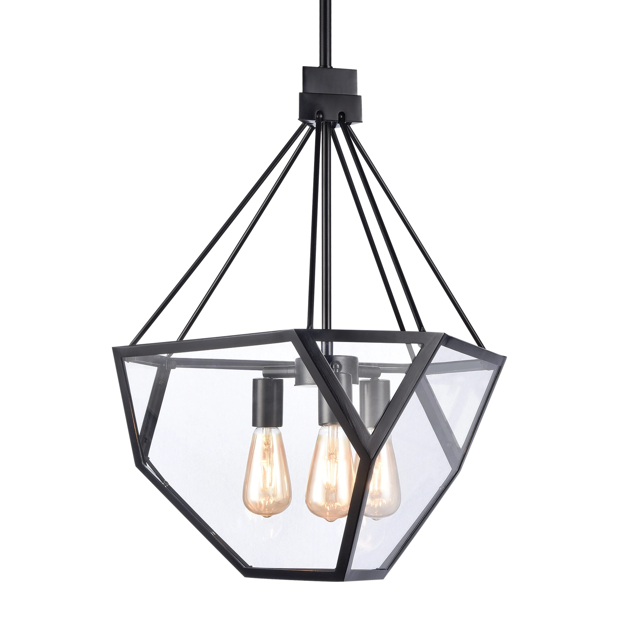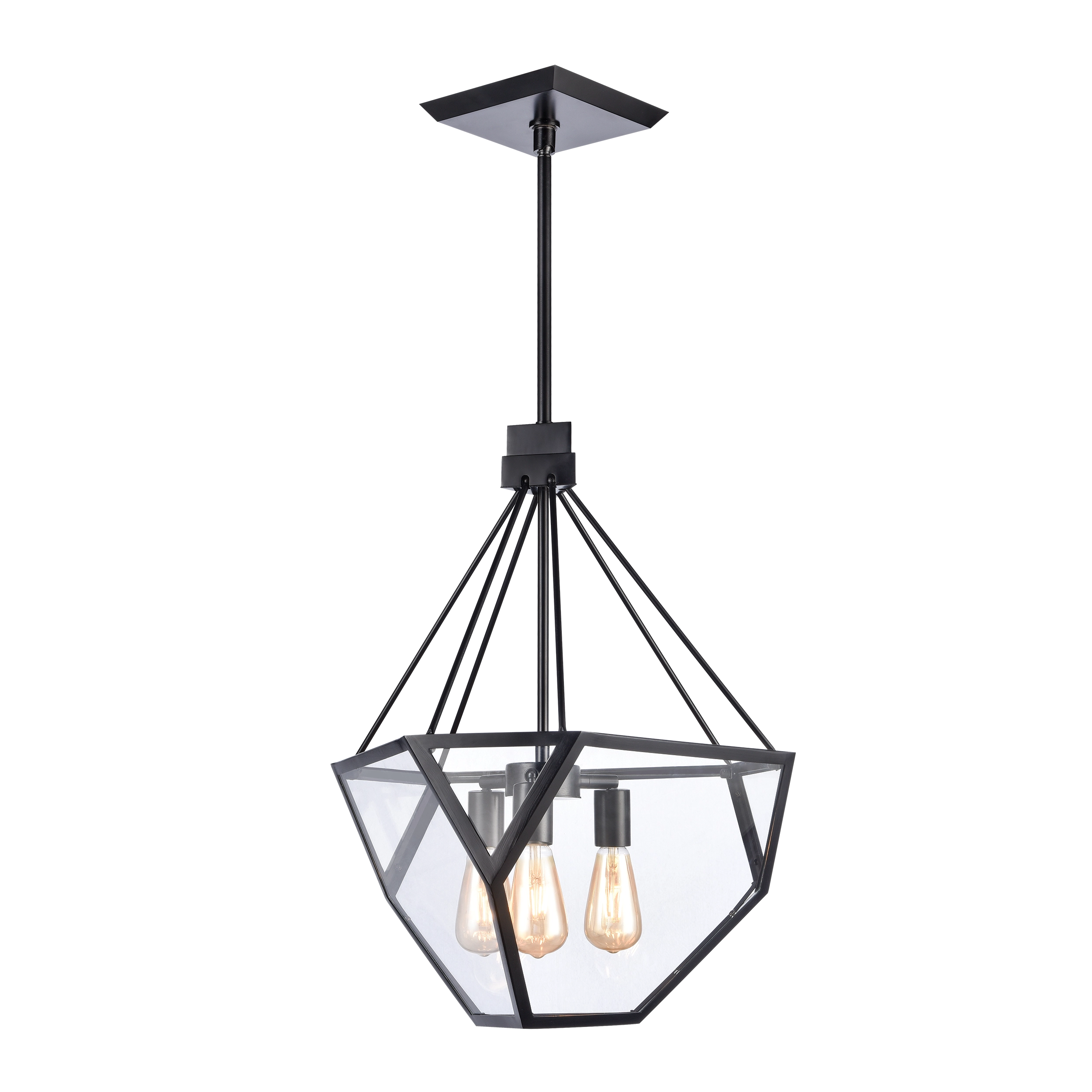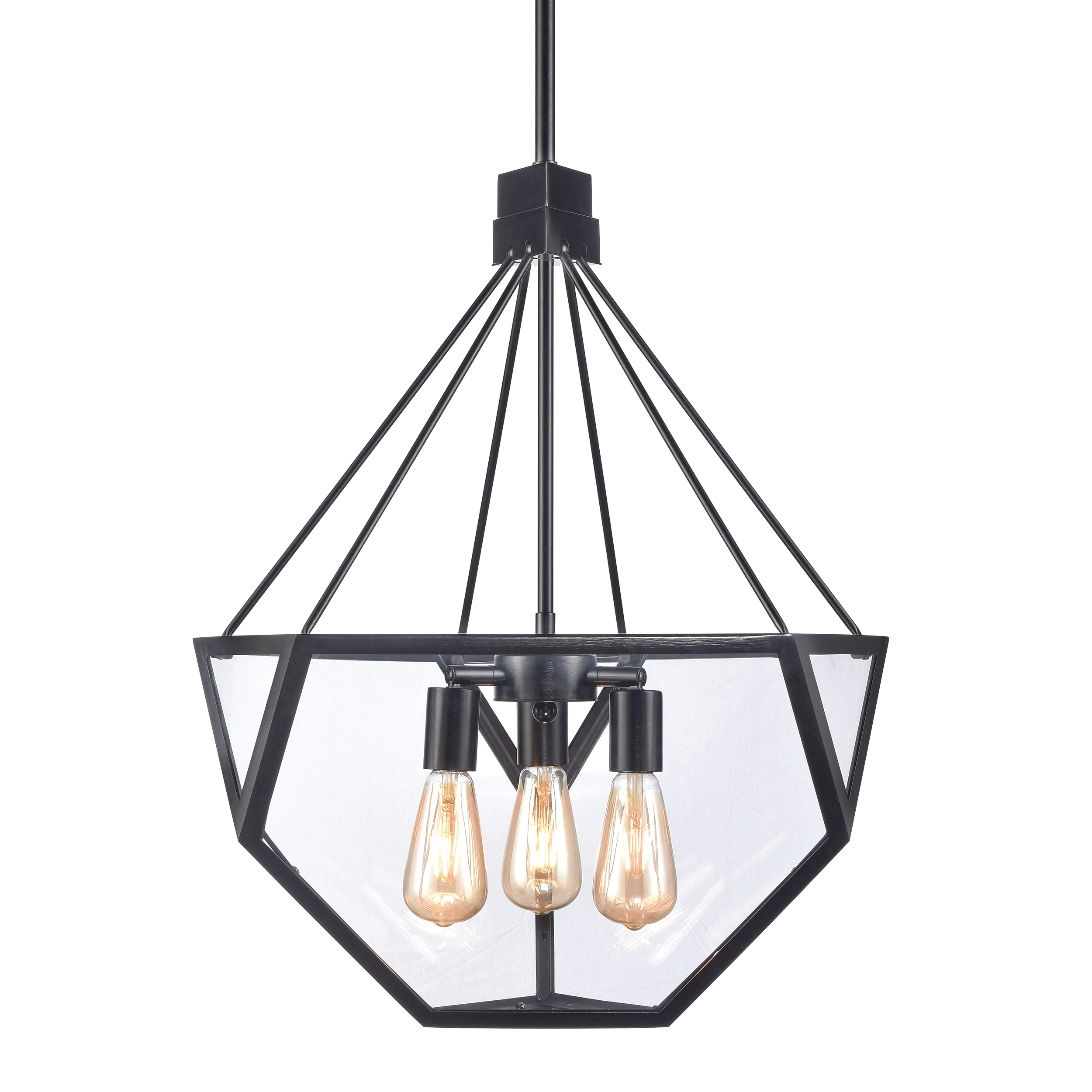 3-Light 21" Architectural Chandelier with Clear Glass & Frosted Glass Panels Included and Satin Brushed Black Metal Finish.