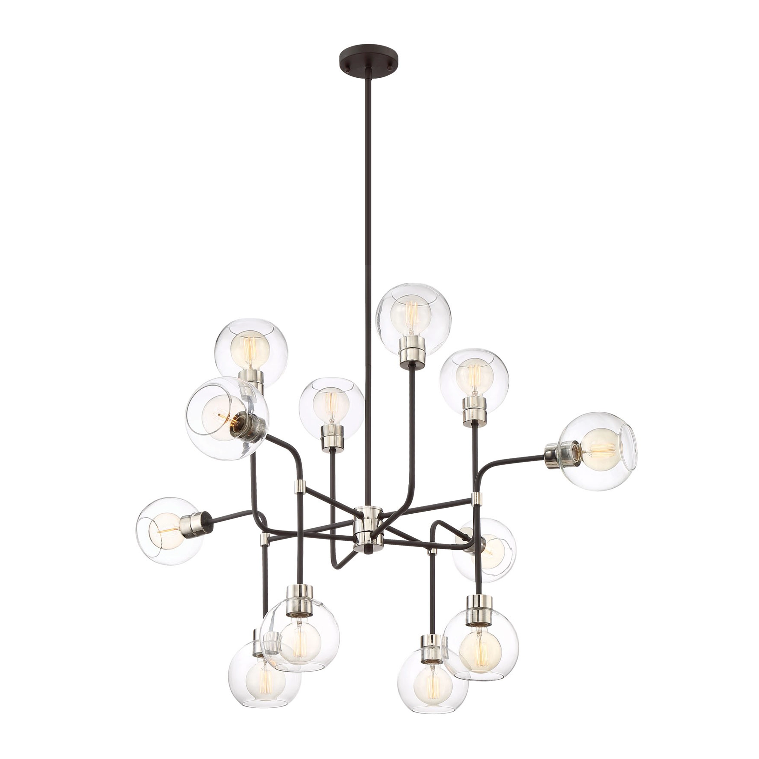 12-Light 43" Geometric Globe Chandelier with Clear Glass Globes and Polished Nickel & Matte Black Metal Finish.