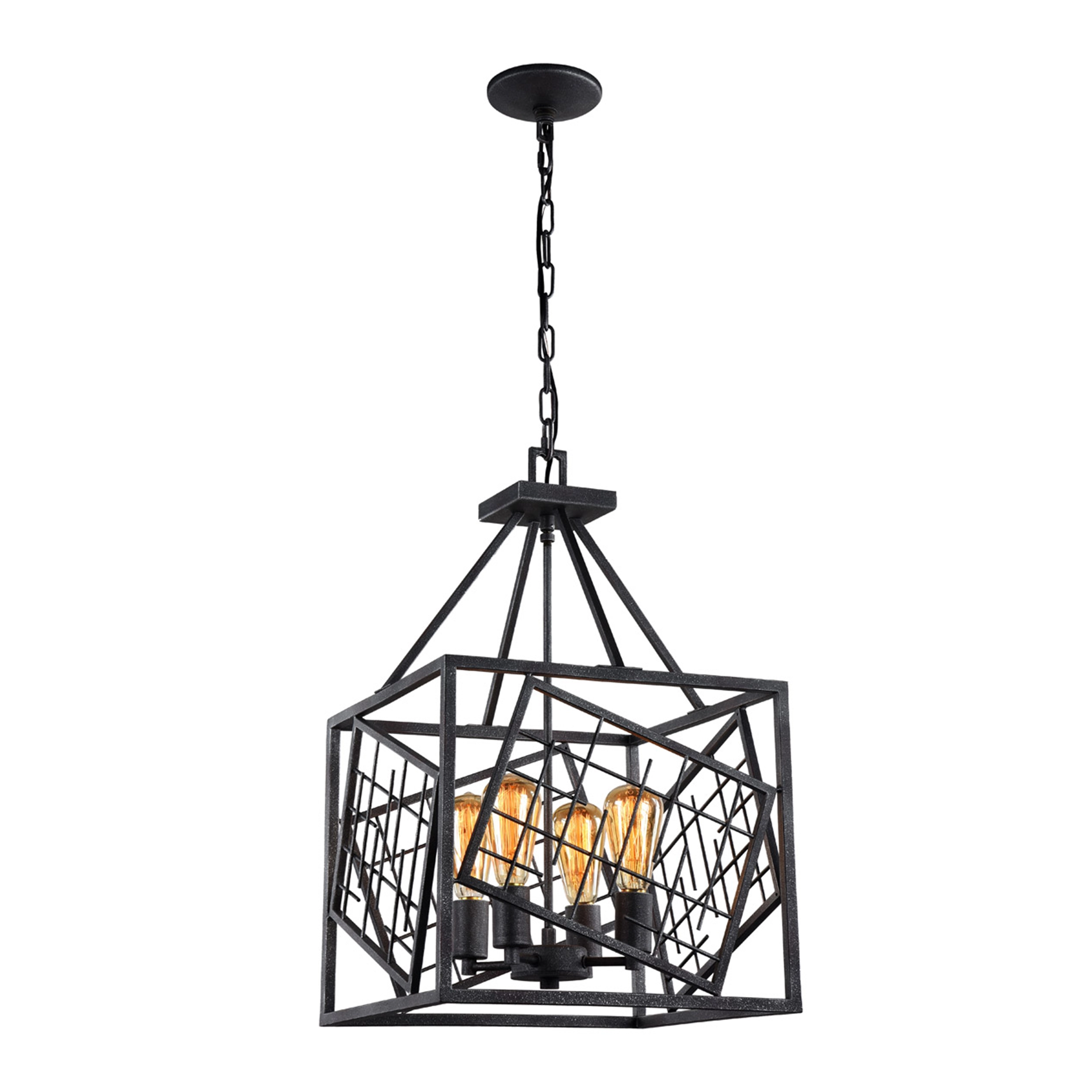 4-Light 15" Square Cage Pendant with Rustic Iron Metal Finish.