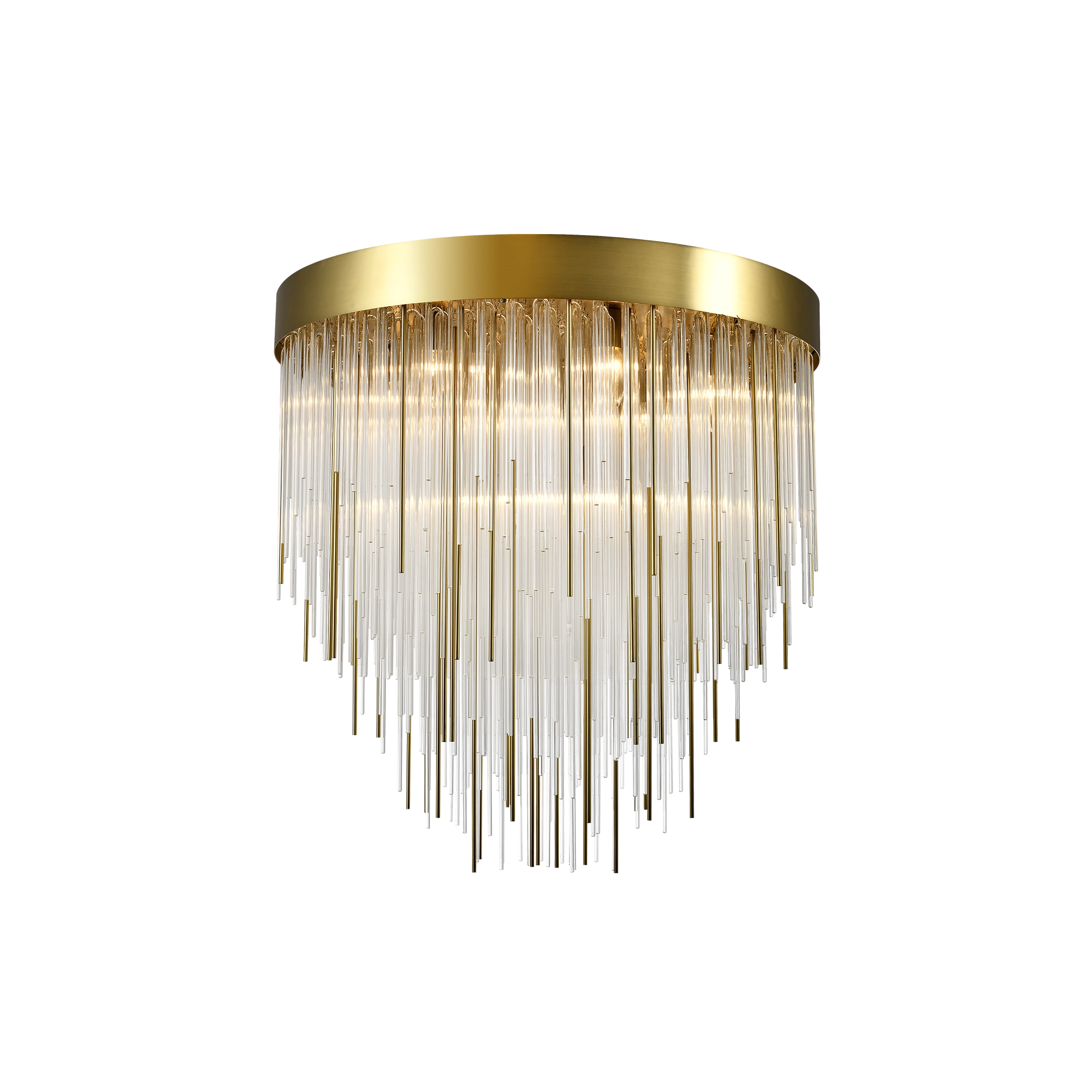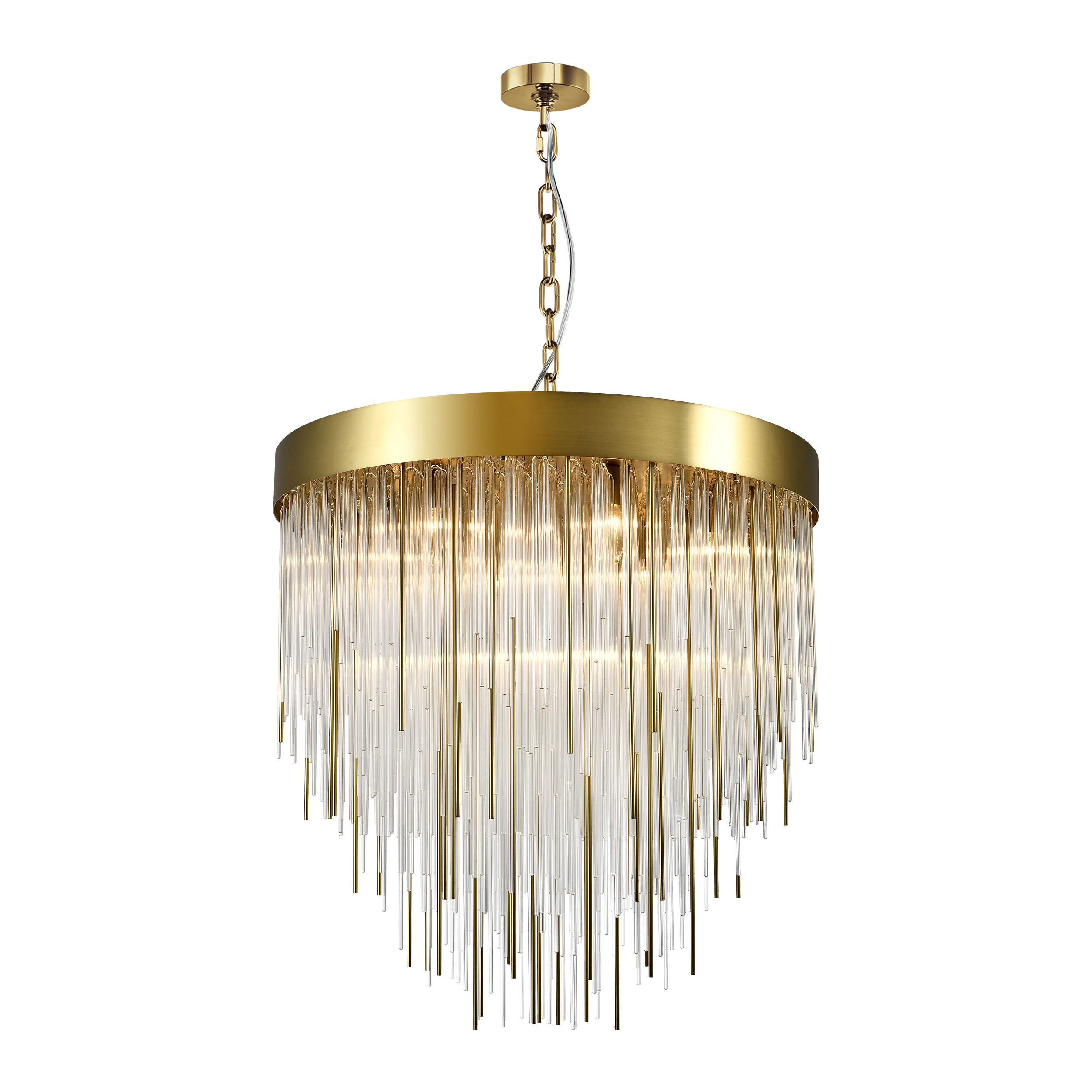 12-Light 30" Round Waterfall Glass Chandelier with Multi-Sized Clear Curved Glass Stems combined with Solid Metal Stems. Refined Metal Details with our Premium Aged Brass Finish and Flush Mount Convertible.