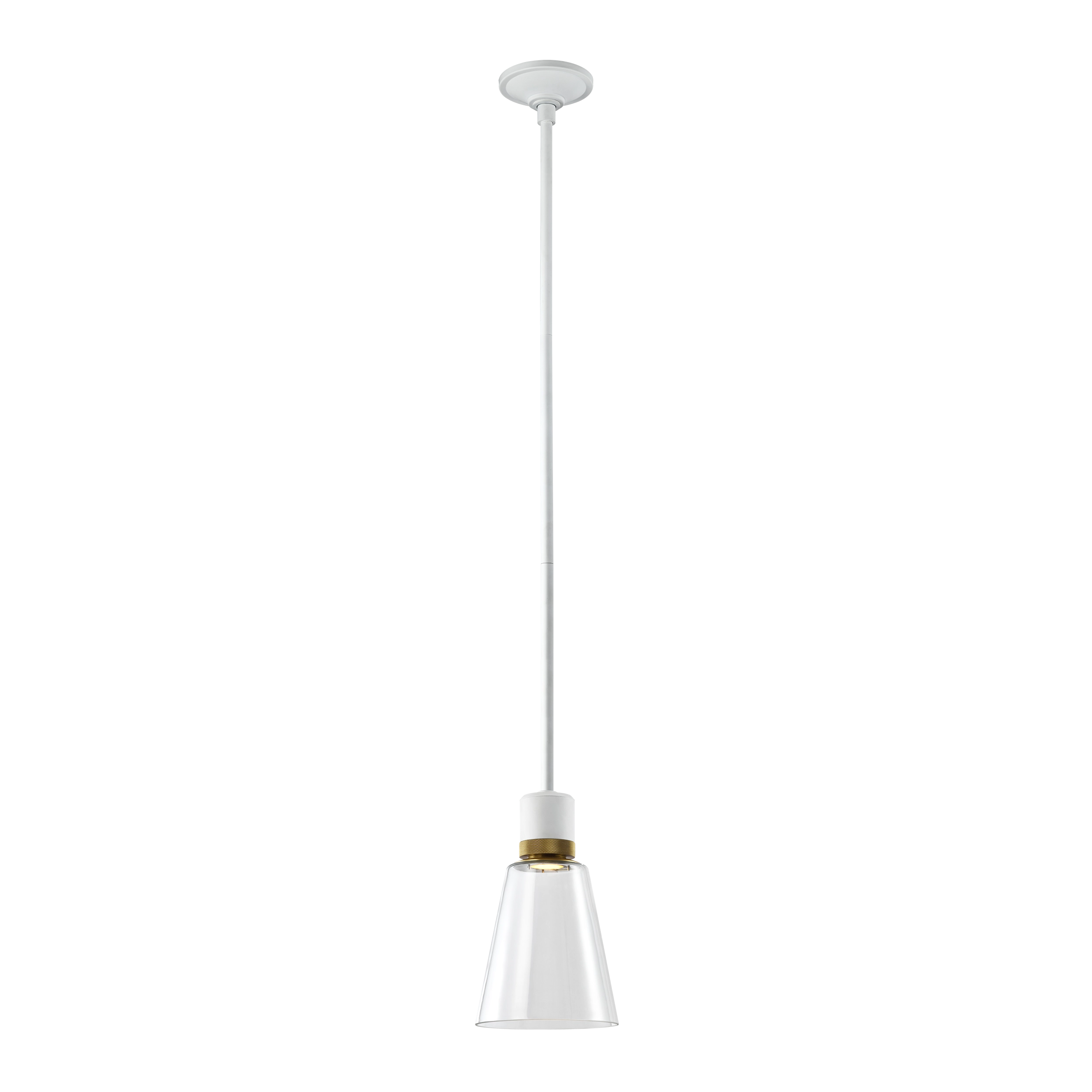 7" High End Clear Glass Bell Shade Pendant Light in Our Chic Matte White Finish with Detailed Aged Brass Diamond Knurled Metal Band. Integrated Replaceable LED with 3CCT 3000K, 3500K and 4000K.